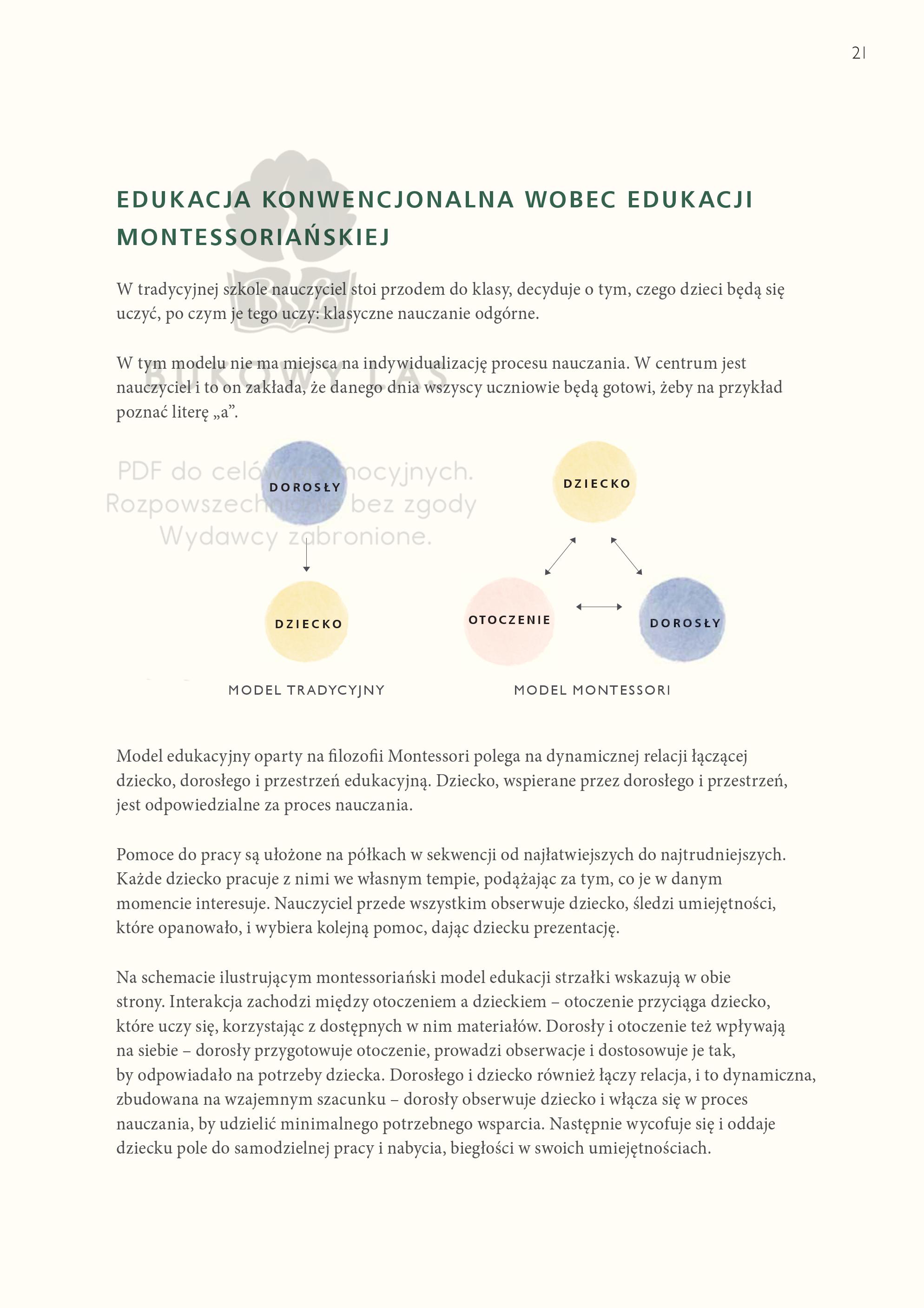 Wyjątkowy poradnik, który pomoże każdemu stać się bardziej skutecznym rodzicem, ale ma też na celu zmienić sposób, w jaki postrzegamy małe dzieci. Jego autorka, doświadczona nauczycielka Montessori, pokazuje jak można przenieść na domowy grunt wartości wynikające z zasad organizacji montessoriańskich placówek edukacyjnych i co dzień cieszyć się byciem z dzieckiem.