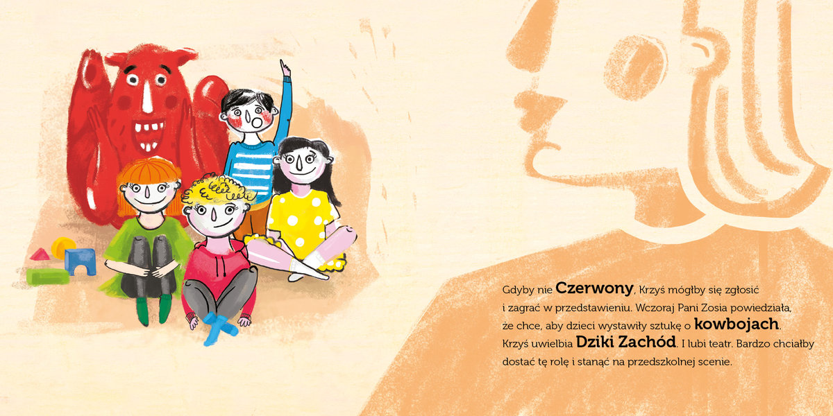 Czerwony kłopot - W książce znalazły się podpowiedzi jak poradzić sobie ze wstydem i budować pewność siebie. Krzyś to również bohater z którym z łatwością utożsami się każdy przedszkolak.