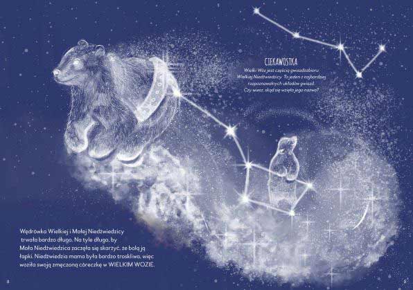 O bliskości i przywiązaniu jest również kolejna książka, którą chcemy wam przedstawić. Paulina Chmurska, autorka albumu „Otulone nocą. Wielka Mała Niedźwiedzica”, zabierze was w podróż po nocnym niebie. W tej niezwykłej wędrówce towarzyszyć będą wam mama i córka – Wielka i Mała Niedźwiedzica. Poruszając się po Drodze Mlecznej spotkacie m.in. Żyrafę, Rysia, Gończe Psy, a nawet Smoka. To świetna książka dla wszystkich wielbicieli kosmosu, w której znajdziecie mnóstwo informacji o gwiazdozbiorach. Piękne ilustracje Elki Grądziel stanowią ich idealne uzupełnienie i spodobają się każdemu dziecku.