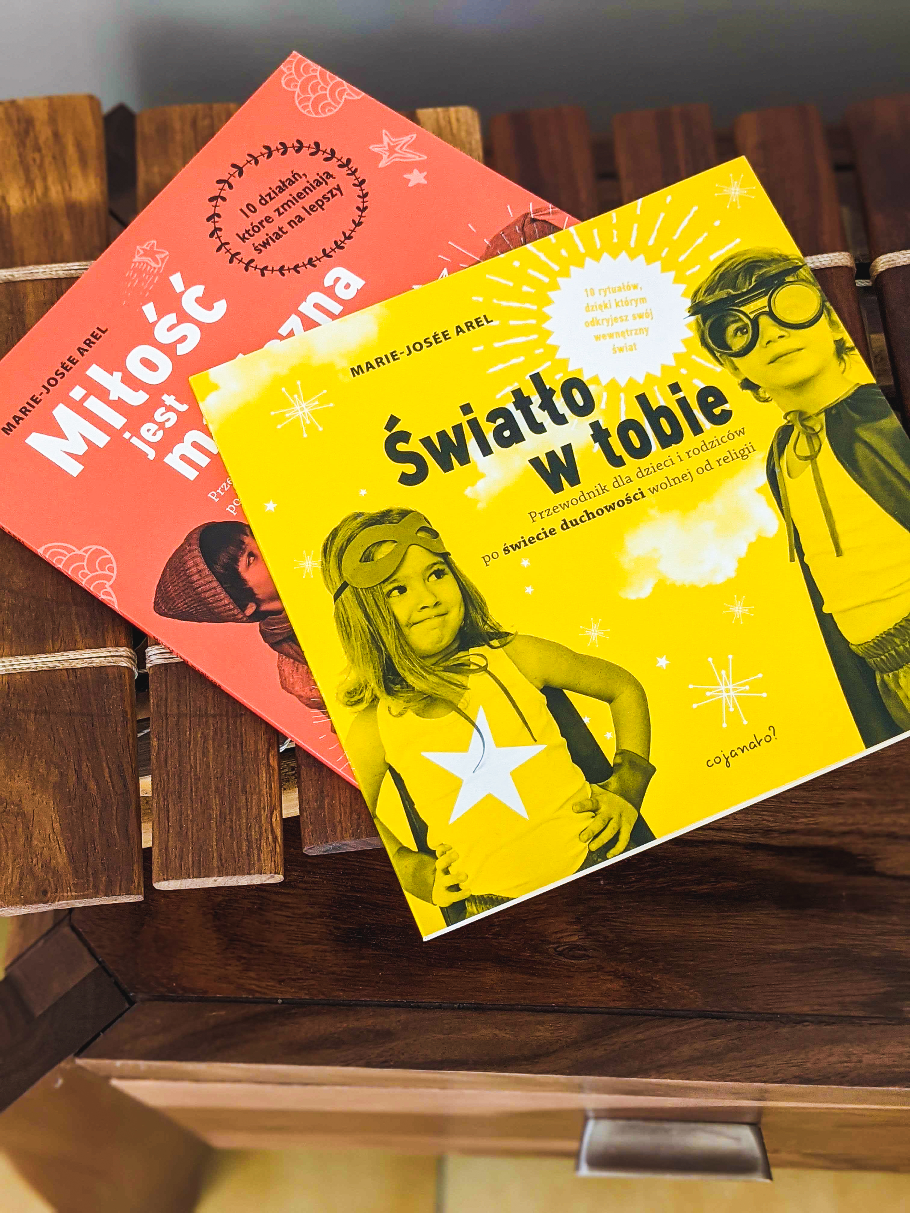 Obie stworzone przez Marie-Josee Arel książki o rozwoju duchowym adresowane są dla rodziców, choć największe korzyści mają z nich czerpać najmłodsi czytelnicy. Opatrzone są kilkustronicowym, napisanym zrozumiałym językiem wstępem dotyczącym duchowości, wiary, boskości i rytuałów („Światło w tobie”) oraz Miłości uniwersalnej, koherencji serca, magii kochania innych ludzi i siebie samych („Miłość jest magiczna”). Na kolejnych kartach obu książek znajdziecie rytuały i działania, dzięki którym wspólnie odkryjecie w sobie duchowość i nauczycie się pielęgnować miłość. To proste ćwiczenia, w których nie ma wygranych i przegranych, dlatego nie martwcie się wynikiem. Mówcie otwarcie o skrywanych potrzebach i marzeniach, skupcie się na niezwykłej mocy waszych ciał. Wybierzcie się na pielgrzymkę, często się uśmiechajcie, pomagajcie tym, którzy tej pomocy potrzebują. Powtarzajcie mantry, czuwajcie, nauczcie się wybaczać. Zawsze działajcie w imię miłości. A czasami wyłączcie telewizor, odłóżcie telefon i zatrzymajcie się w ciszy. Dzięki niej wszyscy możemy kroczyć po ścieżce rozwoju duchowego i kochać. Potrzebuje jej każdy z nas.