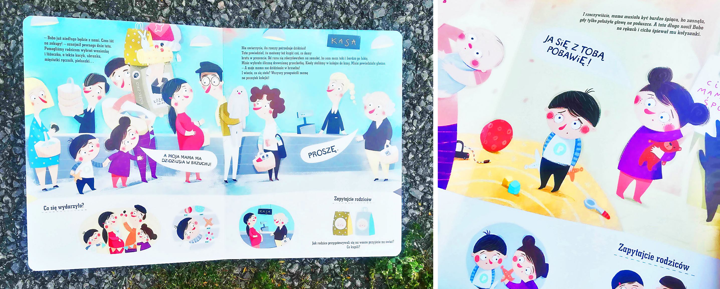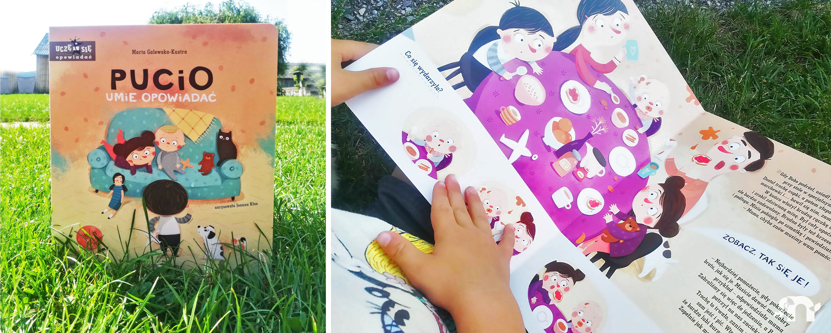 Każda kartka tekturowej książki jest zbudowana w taki sam sposób — większość strony zajmuje ilustracja i opowiadanie, natomiast na dole znajdziemy ważne scenki, które mogą być punktem wyjścia do rozmów, oraz pytania od autorki, które mobilizują do opisu własnych przeżyć. Na końcu dzieci czeka "test" — ostatnia strona to małe ilustracje z podsumowaniem historii. Zadaniem dziecka jest jej opowiedzenie. Czyli przy tym Puciu będzie wyjątkowo rozmownie, głośno i intensywnie :)
