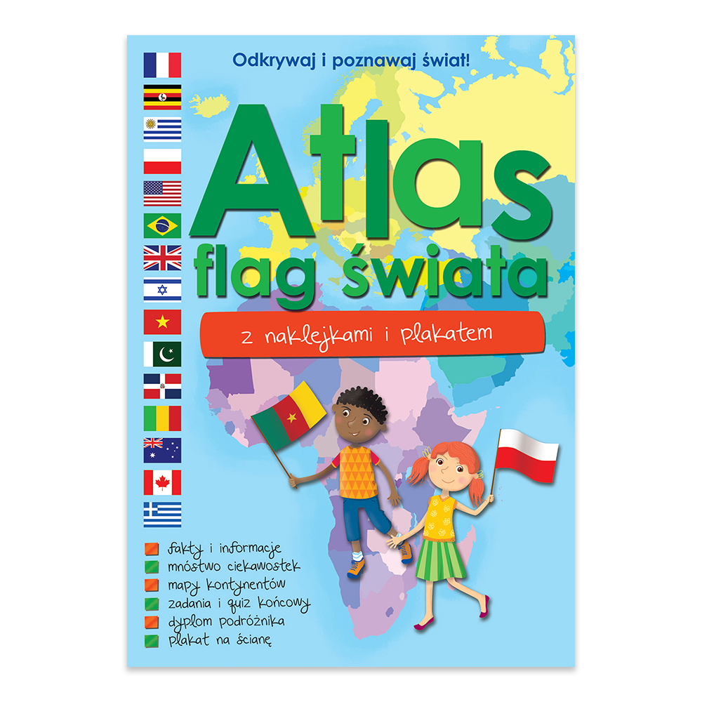 Atlasy, dzięki którym dzieci dowiedzą się jak wyglądają flagi państw. Atlasy z powodzeniem łączą w sobie walor edukacyjny oraz zabawę. W środku znajdują się naklejki, które dziecko umieszcza w odpowiednich polach.
