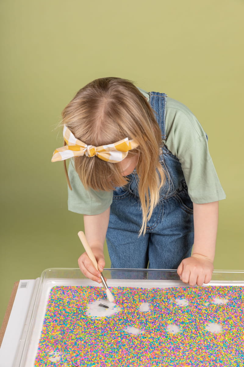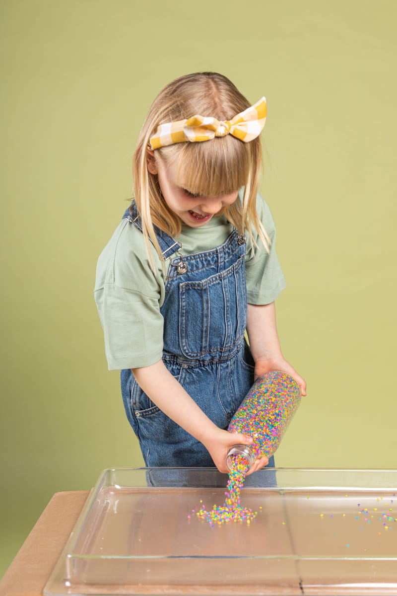 Pozwól swojemu dziecku poruszać, potrząsać i manipulować butelką, aby odkrywać kolory i figurki tematyczne zamknięte w butelce. Światło, kolor... magia! Obserwowanie zachwycającego świata barw, przepływającego, połyskującego brokatu, cekinów czy pomponów wprawi dziecko w błogi stan relaksu i spokoju. Skupienie uwagi na pływających elementach będzie pomocne przy nauce koncentracji i uważności.