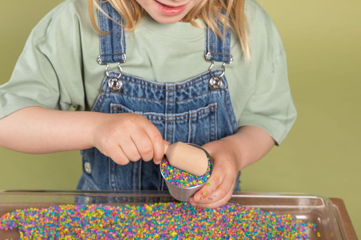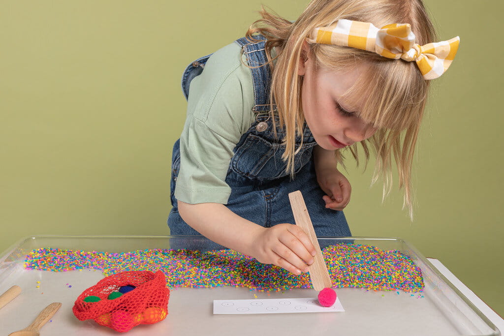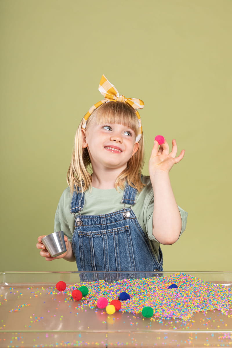 Zestaw WOW! to wyjątkowa propozycja dla dzieci powyżej 3 roku życia. Oprócz butelki wypełnionej kolorowym ryżem sensorycznym, mamy w zestawie: kolorowe pompony, drewniane akcesoria - idealne do nabierania, łapania, segregowania kolorowego ryżu i pomponów, jak i naklejki z owadami do zabawy.
