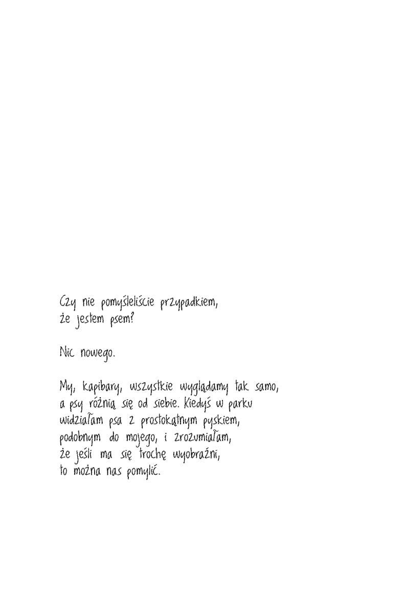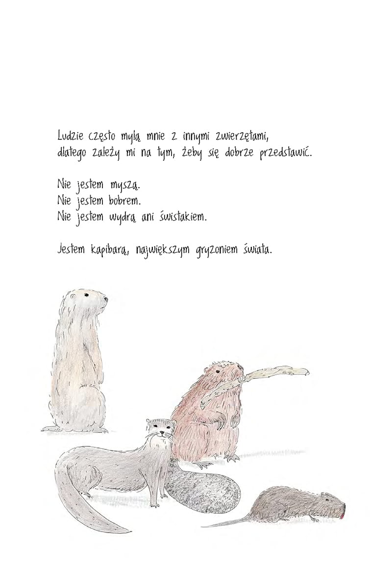 Michela Fabbri w piękny sposób wykorzystała popularność największych gryzoni na świecie. Książka "Być jak kapibara" pełna jest sympatycznych i prostych ilustracji, a ciekawy tekst zainteresuje zarówno dzieci, jak i dorosłych. Publikacja została napisana w taki sposób, że jest znakomitym sposobem na odrobinę relaksu połączonego z nauką. Nie tylko o kapibarach, ale również o świecie, życiu w społeczeństwie i najważniejszych wartościach, jakimi powinien kierować się człowiek.