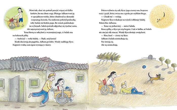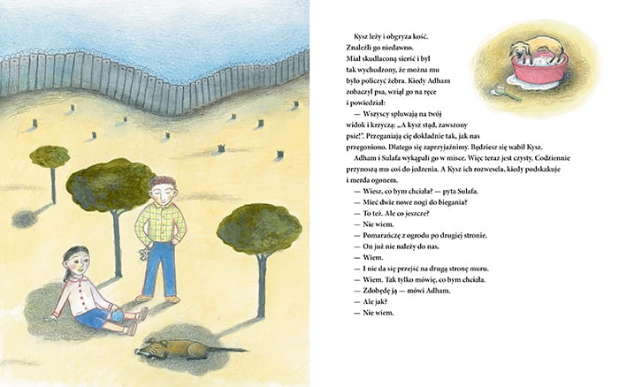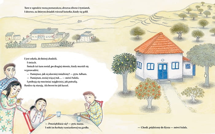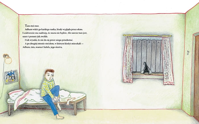 Ale zawsze tam jest, szary i ponury jak zwykle. I tak wysoki, że nie da się przez niego przedostać. A po drugiej stronie stoi dom, w którym kiedyś mieszkali — Adham, tata, mama i Sulafa, jego siostra. Sulafa tak bardzo chciałaby dostać pomarańczę z ich dawnego ogrodu!
