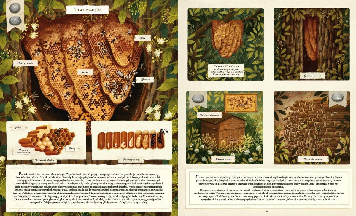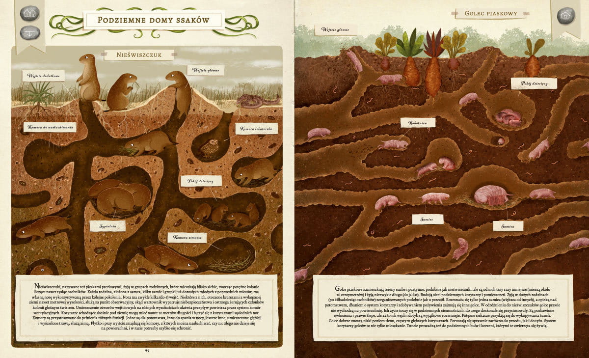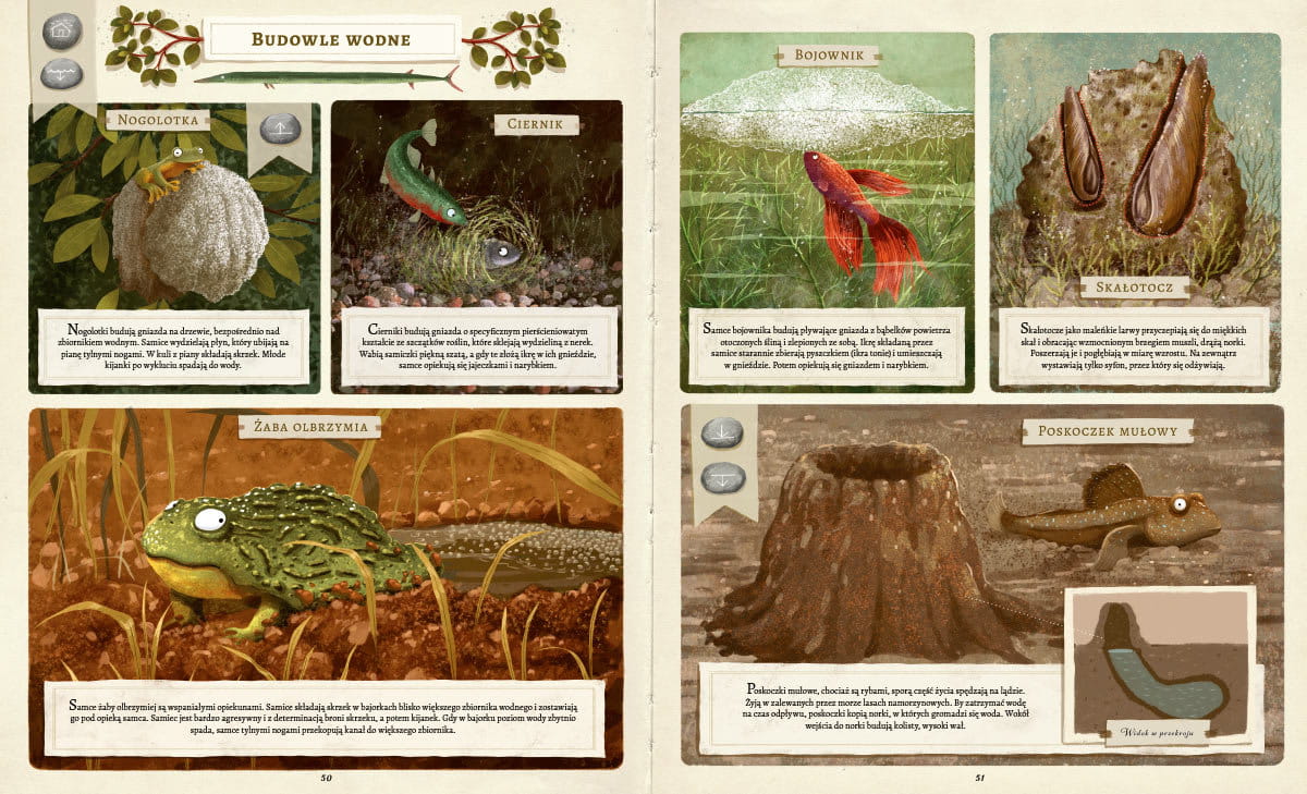 Wśród licznych przykładów znalazły się między innymi: gniazdo uszyte przez krawczyka, gniazda ze śliny, jedna z największych ptasich budowli, czyli kopiec lęgowy nogala zmiennego, spiżarnia dzięciura żołędziowego, ogromna konstrukcja tkaczy towarzyskich, altanka ogrodnika brunatnego, papierowe gniazdo osy pospolitej, gniazdo pszczół i innych owadów, kopce mrówek, ale również mosty i tratwy mrówek legionistek, termitiery, pułapki pająków, kawalerki larw chruścików, rozbudowane nory golców piaskowych, żeremia bobrów, krecie tunele i wiele innych.