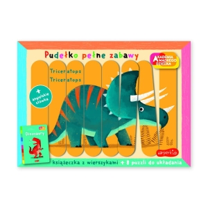 W środku znajdują się puzzle w postaci pionowych patyczków – 8 obrazków dinozaurów do ułożenia, tacka na której można układać rysunek oraz książeczka z wierszykami dotyczącymi obrazków. Nowością są dodatkowe napisy w języku angielskim.