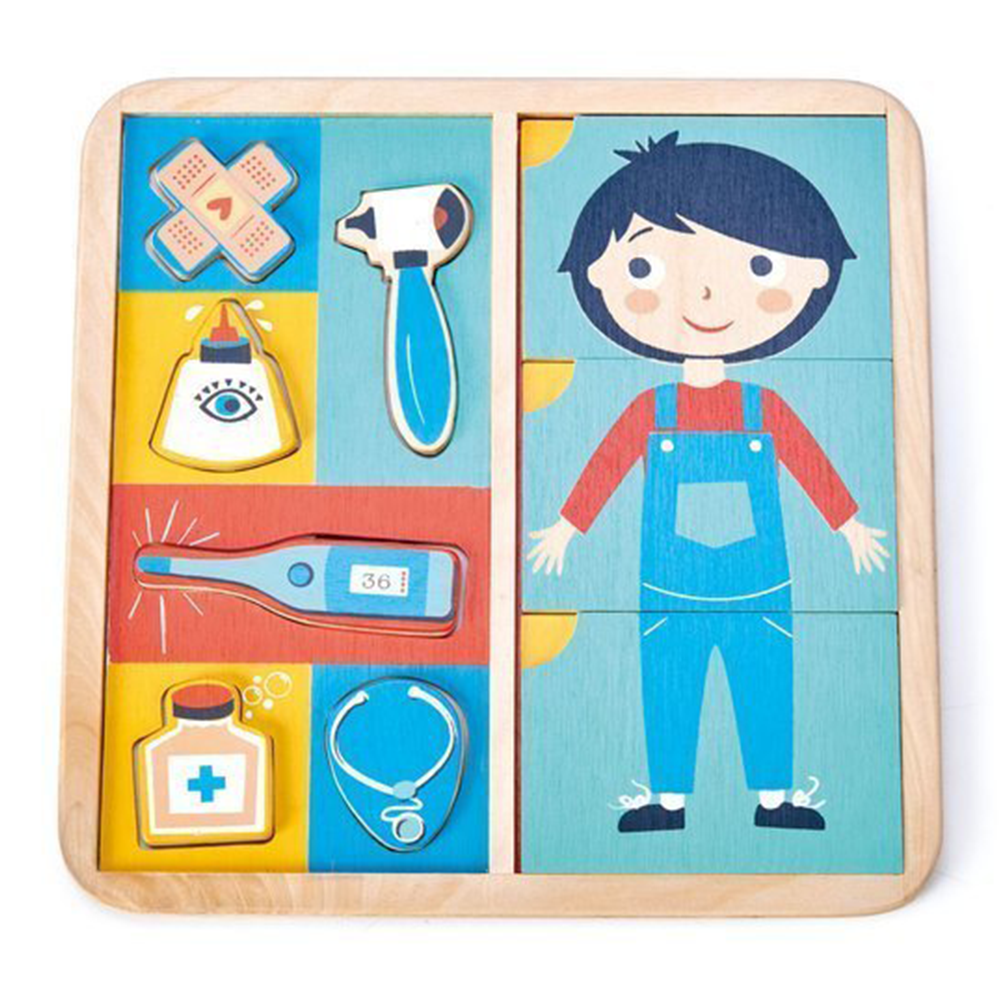 Drewniana układanka do nauki o ludzkim ciele! Edukacyjna układanka składająca się z 12 elementów, które należy dopasować w odpowiednie miejsce na planszy. Plansza podzielona jest na dwie części: po jednej stronie jest postać chłopca z zaznaczonymi głównymi narządami i kośćmi, a po drugiej stronie należy dopasować prawidłowe lekarstwa i przyrządy do zilustrowanych dolegliwości, których możemy doznać. Dziecko poznaje budowę ciała człowieka i uczy się nazywać części ciała, opisywać dolegliwości i pomocne lekarstwa.