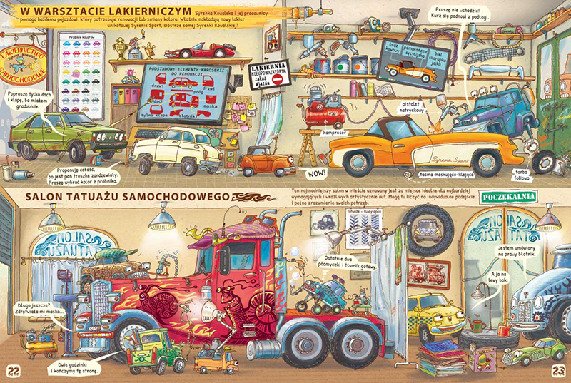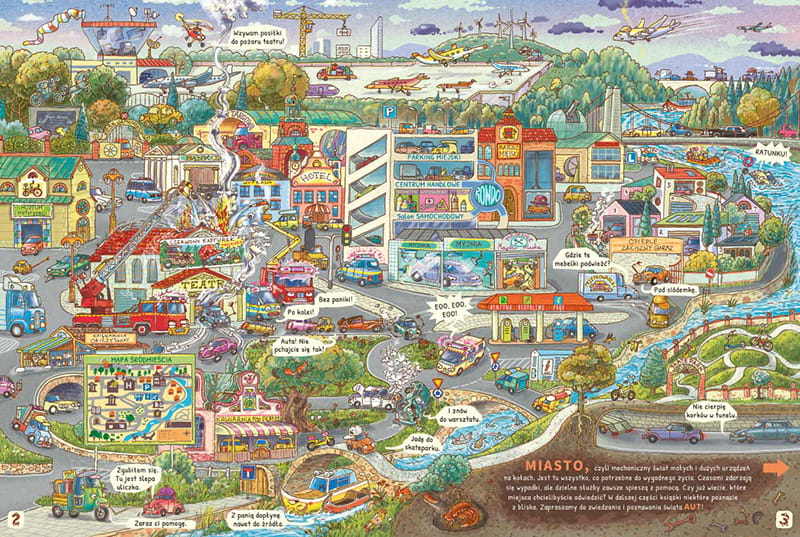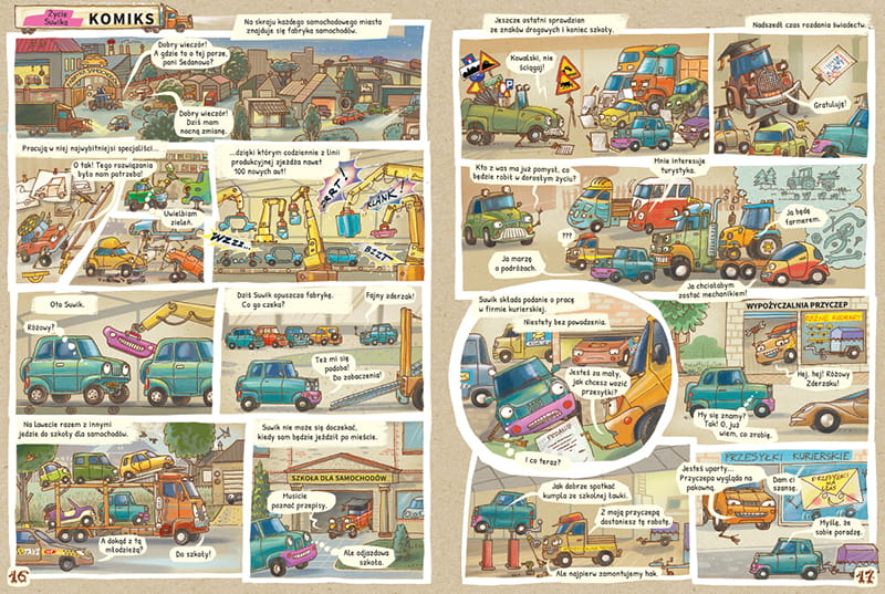 Takiej książki jeszcze nie było! Dowiesz się, co lubią samochody, a czego nie, jak są zbudowane lub czym zajmowały się przez całe życie. Wehikuł czasu zabierze Cię w przeszłość, w epokę dinoaut oraz w przyszłość... Zobaczysz prace projektantów, spotkasz niezwykłe samochody wyścigowe, odwiedzisz wielkie miasto motoryzacyjne, szkołę samochodową, parking i targi.