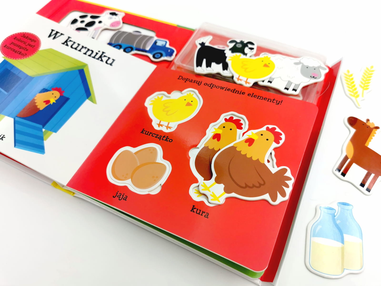 W książeczce znajdziemy krótkie polecenia zachęcające malca do interakcji. Trzeba wskazać na stronie żółte kurczątko, czy spróbować naśladować dźwięk traktora lub miauczeć kot. Dodatkowo na każdej stronie mamy trzy otwory z wizerunkiem zwierzątek lub przedmiotów, w które trzeba dopasować puzzle. Każdy, kolorowy puzzel jest z jednej strony podpisany, by uczyć się nazw zwierząt i przedmiotów z gospodarstwa, z drugiej strony ma kolorowy obrazek. Maluszek przez zabawę ćwiczy swoje paluszki oraz skupienie.