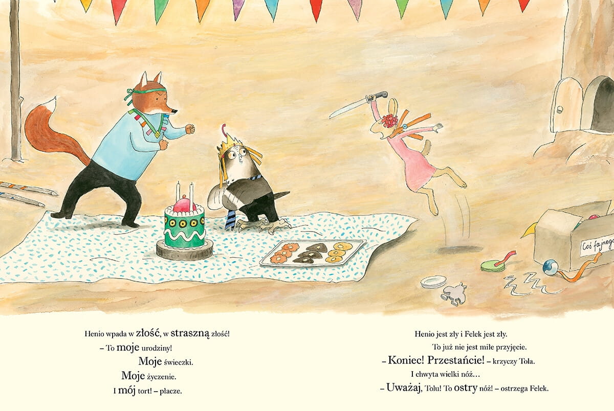 W ciepłej, przytulnej norce w środku lasu mieszka nierozłączna para: lis Felek i zajączka Tola. Ich sąsiad, puchacz Henio, obchodzi urodziny. Jest tort. „A gdzie świeczki?” – pyta Felek. Henio nie rozumie. Nigdy nie miał tortu ze świeczkami. „Musisz zdmuchnąć świeczki” – tłumaczy Tola. Ale Henio ma inny pomysł.