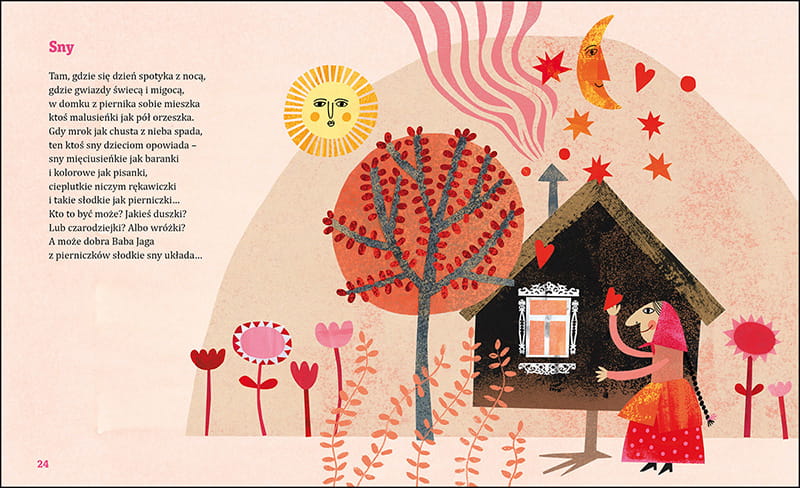 Śpi już niedźwiedź i motylek. Na dnie szafy drzemie duszek. Ziewa pająk. Kot przeciąga się leniwie… „Sen po dachu chodzi, kołysankę śpiewa”. Liczymy barany, liczymy bałwany… i zasypiamy. A „dobra Baba Jaga z pierniczków słodkie sny układa”.