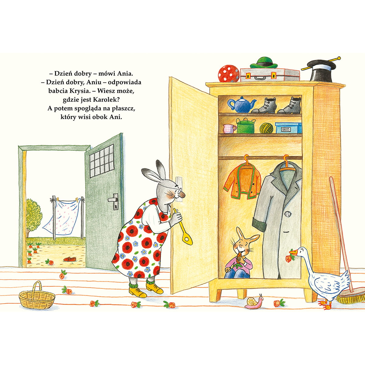 Karolek uwielbia bawić się u babci w ogrodzie. A gdy zbyt długo nie wraca, babcia wyrusza na poszukiwania… Przygody niesfornego króliczka autorki bestsellerowych książek o ulicy Czereśniowej rozbawią każdego malucha.