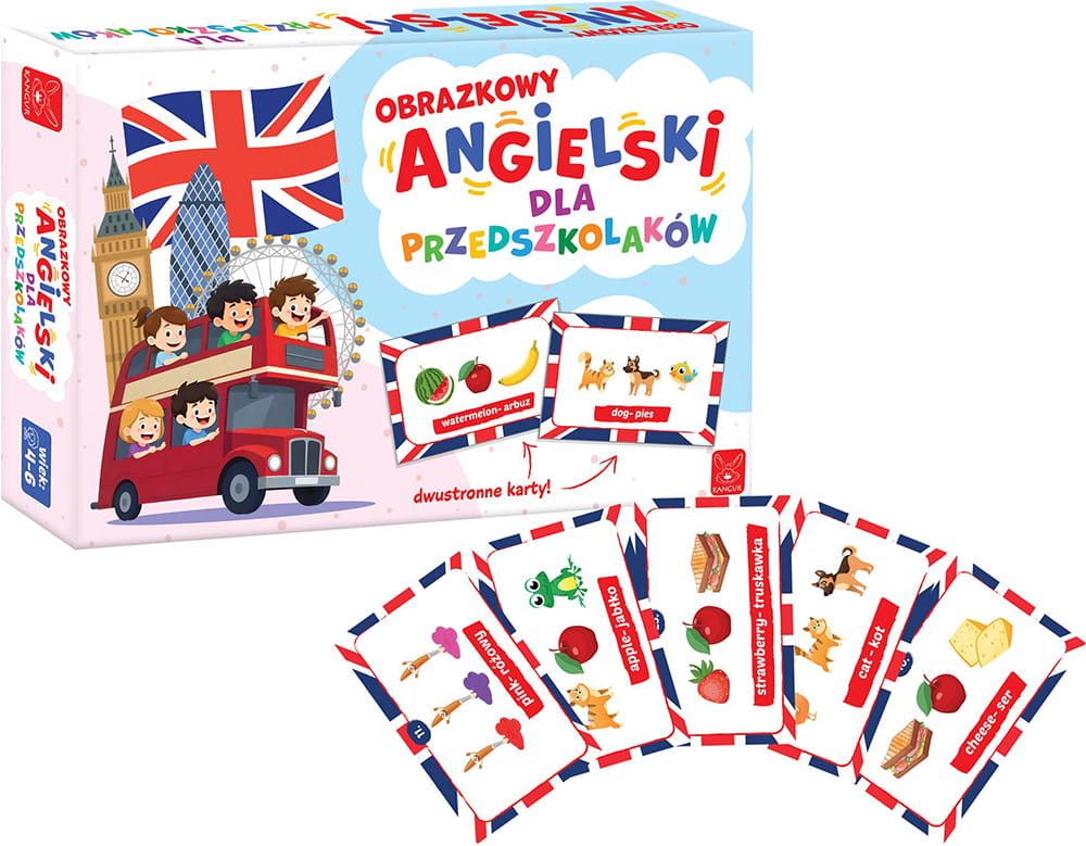 54 ilustrowanych kart, 108 zagadek/słówek, instrukcja