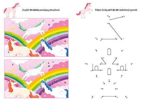 SZUKANIE RÓŻNIC, LABIRYNTY, KOLOROWANIE, RYSOWANIE PO ŚLADZIE, ŁĄCZENIE KROPEK, LICZENIE oraz PRZYKLEJANIE NAKLEJEK.