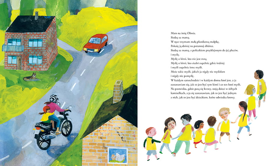 Czytelnik strona po stronie zmienia punkt widzenia, patrzy oczami kolejnych dzieci, myśli ich myśli. Ten zabieg niezwykle działa na wyobraźnię i skłania do zastanowienia nad tym, kim jestem, co nas łączy, a co różni, czego nie widać na zewnątrz.