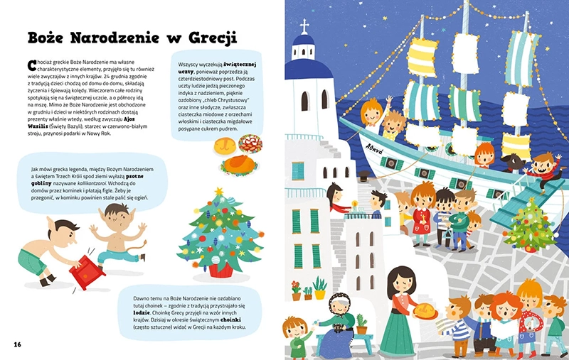 Książka wskazuje na psotne gobliny, które wchodzą do greckich domów przez kominek i rozrabiają, oraz na tajemniczą postać z włoskiej tradycji, znaną jako Befana, która zaskakuje najmłodszych nietypowymi prezentami. Czytelnik odkryje także niezwykły pomysł dzieci z Wenezueli, które na pasterkę jeżdżą na wrotkach.