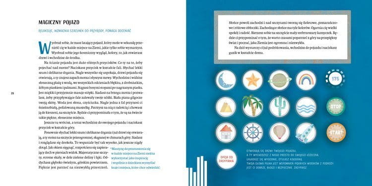 Przy dłuższym stosowaniu wzmocnią koncentrację uwagi, rozwiną wyobraźnię, zredukują lęki i poprawią relacje w grupie i w domu. Będą inspiracją do ćwiczenia wyobraźni, tworzenia własnych scenariuszy i tym samym wspaniałej zabawy. Czerpiąc to, co najlepsze, z praktyk medytacyjnych, pozytywnych afirmacji, wizualizacji i pracy z oddechem, autorka wprowadza małych i dużych czytelników w bajkowy, bezpieczny i błogi świat niczym nieskrępowanej wyobraźni.Wystarczy zacząć od paru spokojnych, głębokich oddechów…