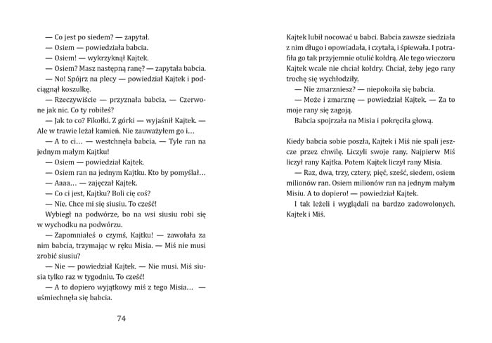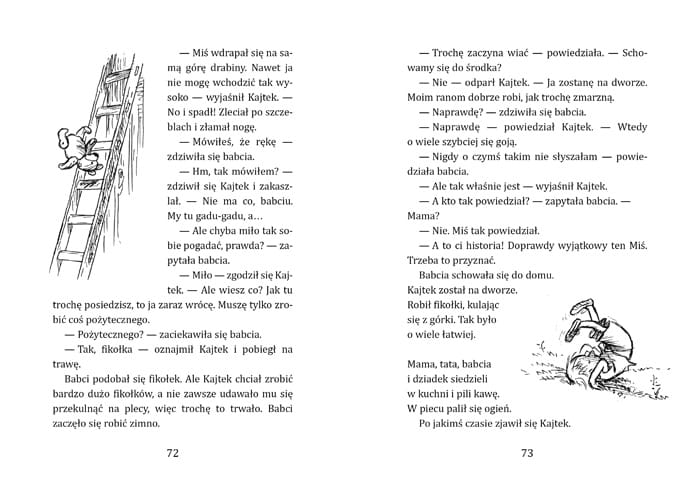Posłuchaj o tym, jak Kajtek prawie nauczył się pływać, jak próbował wbiec na drzewo i jak bawił się w pustynię w środku zimy. Częstą towarzyszką zabaw Kajtka jest Tosia. Każdego wieczora przed zaśnięciem Kajtek opowiada Misiowi o tym, co się wydarzyło tego dnia. I razem zasypiają.