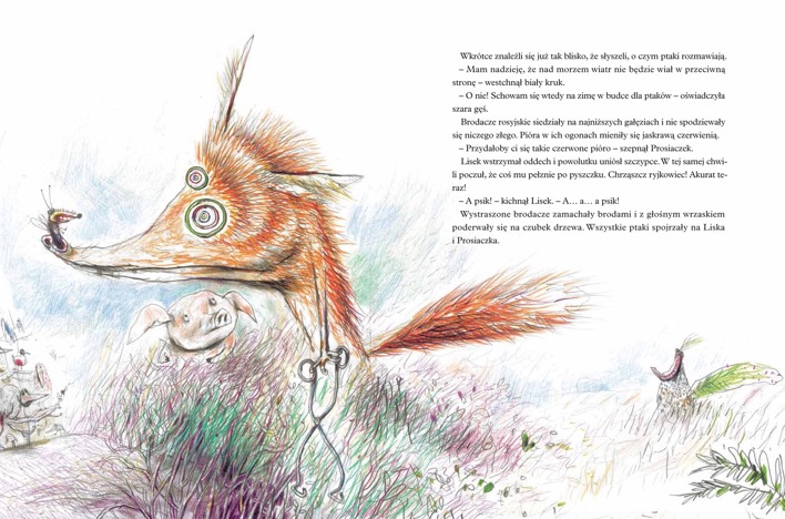 Wraz ze swoim najlepszym kumplem, Prosiaczkiem z niezakręconym ogonkiem pod chętnie odwiedzanym przez ptaki drzewem, lisek otwiera ptasią kawiarenkę, w której płaci się właśnie piórami. Wśród potraw są prawdziwe frykasy: rolada z żuka, zupa z pszczelego mleczka, a nawet mrówki do własnodziobnego zbierania.
