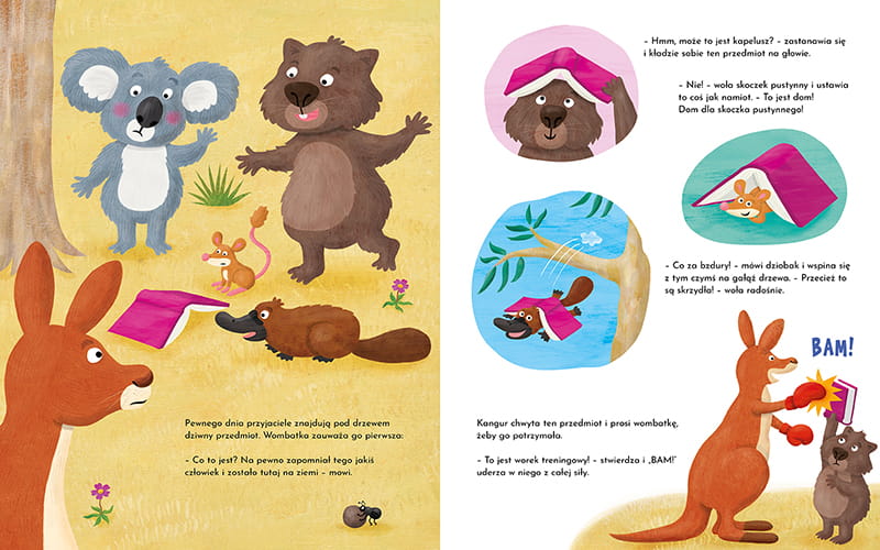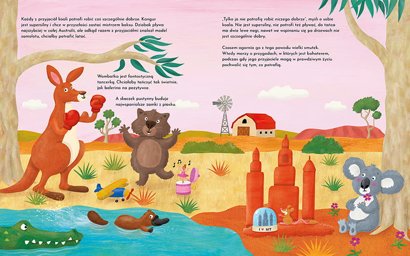 Koala ma czworo wspaniałych przyjaciół i każdy z nich potrafi robić coś szczególnie dobrze. Kangur jest silny jak bokser, dziobak najszybciej pływa, wombatka świetnie tańczy, skoczek pustynny buduje najwyższe zamki z piasku. A koala?