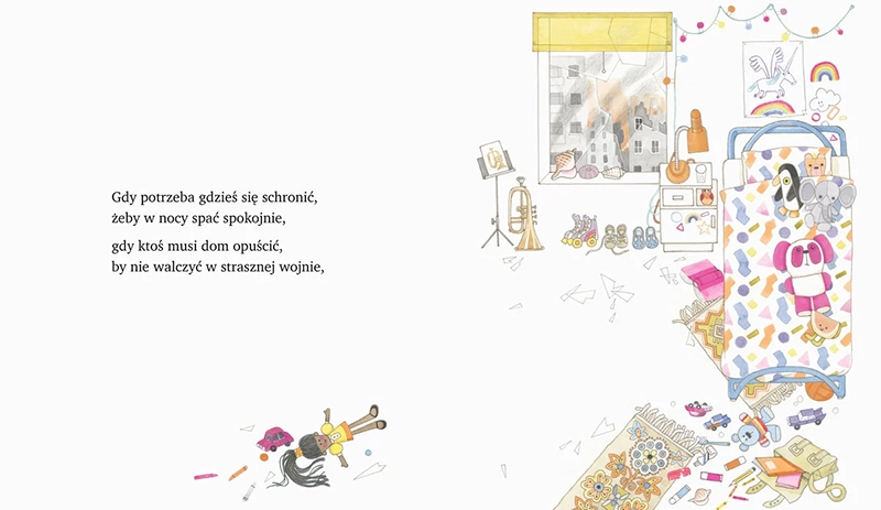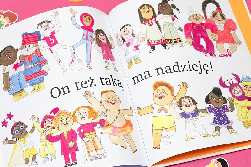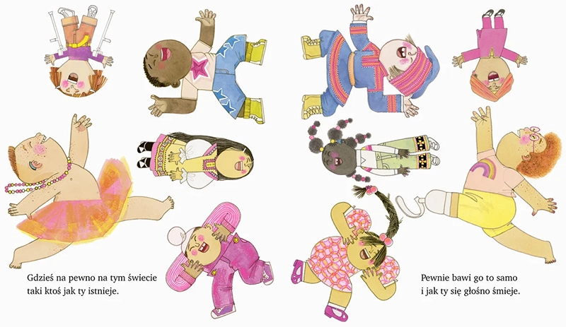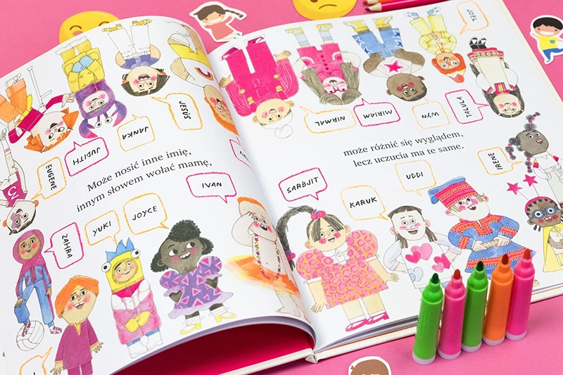 Zabawnie zilustrowana, niezwykle kolorowa książka z lekkim rymowanym tekstem, która jednak porusza i skłania do refleksji. Bo subtelnie, na miarę dziecka, ale przecież bardzo sugestywnie dotyka takich tematów, jak ludzka różnorodność, wielokulturowość, a także wojna i imigracja. A przez to rozbudza empatię, szacunek wobec innych i życzliwość. Lektura do rodzinnego czytania – dobry punkt wyjścia do rozmów i odpowiedzi na nie zawsze łatwe dziecięce pytania.