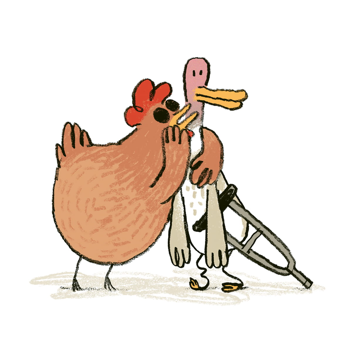 Wielki świat jest bardzo niebezpieczny. Dlatego samotna kulawa kaczka nigdy dotąd nie wypuszczała się poza swoje podwórko. Ale pewnego dnia niespodziewanie pojawia się u niej ślepa kura. Nowa znajoma okazuje się pełna animuszu, a na dodatek ma śmiały plan: chce odnaleźć miejsce, gdzie spełniają się sekretne marzenia. Co więcej, proponuje, żeby kaczka towarzyszyła jej w tej wyprawie jako przewodniczka! Tylko czy kaczka znajdzie w sobie dość odwagi, żeby wybrać się w nieznane?