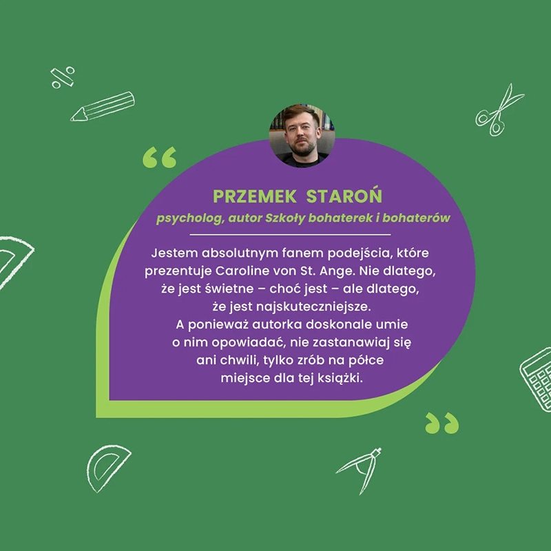 "Jestem absolutnym fanem podejścia, które prezentuje Caroline von St. Ange. Nie dlatego, że jest świetne – choć jest – ale dlatego, że jest najskuteczniejsze. A ponieważ autorka doskonale umie o nim opowiadać, nie zastanawiaj się ani chwili, tylko zrób na półce miejsce dla tej książki." - Przemek Staroń, psycholog, autor Szkoły bohaterek i bohaterów