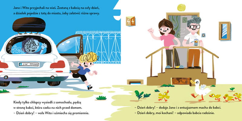 Jano i Wito odwiedzają babcię. Witając się, mówią „dzień dobry” i przytulają się do niej. Jest tak miło i dobrze o tym powiedzieć. Magiczne słowa to nie tylko „proszę”, „przepraszam” i „dziękuję”, ale też „kocham cię” i „jesteś dla mnie ważny”.