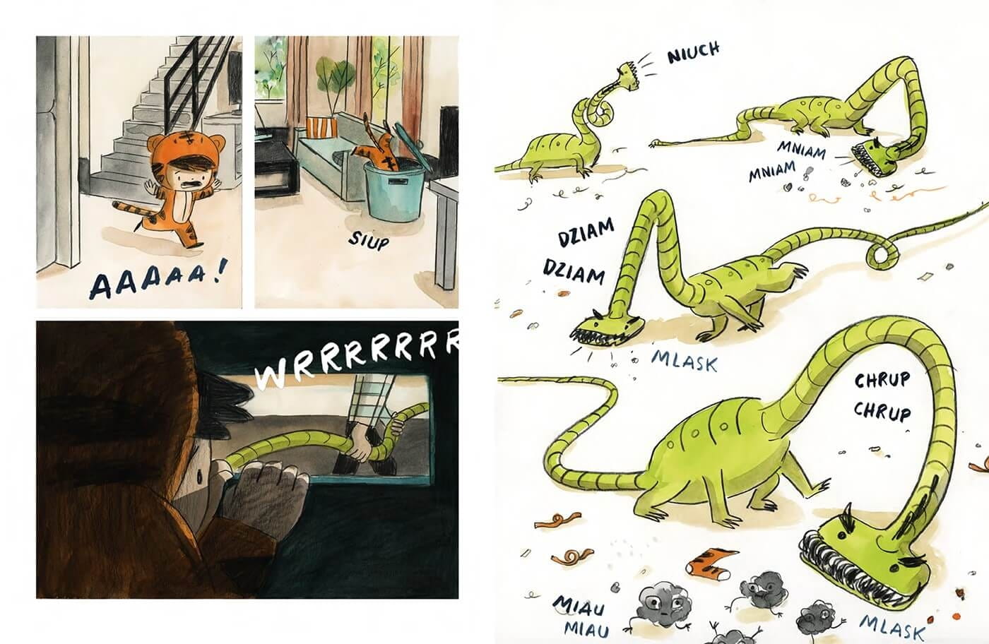 Świat za progiem własnego pokoju jest pełen niespodzianek i dziwnych, arcygroźnych domostworów. Czasem huczą i wsysają wszystko wokół, niekiedy zieją chłodem albo przeżuwają i ciumkają godzinami to, co wpadnie im do paszczy. Warczą, buczą i hurgocą po całym mieszkaniu.