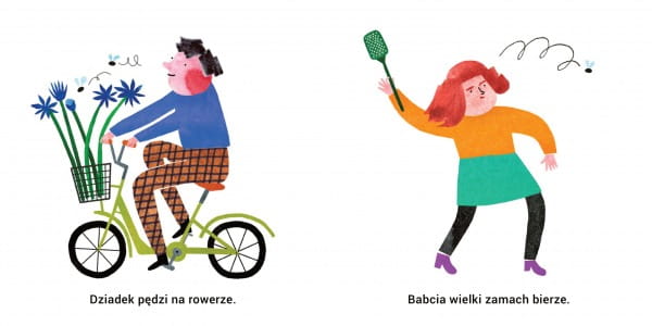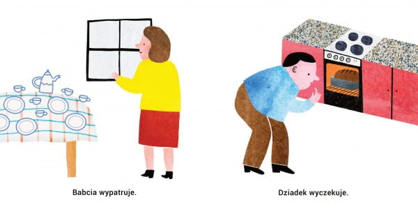 "Przygotowując ilustracje do książki „Moja mama, mój tata” myślałam o moich rodzicach. Przy pracy nad „Moją babcią, moim dziadkiem” szybko zorientowałam się, że moi rodzice – ci z okładki poprzedniej części – są już przecież dziadkami i powinni być bohaterami również tej książki. Starałam się zatem zachować perspektywę kilkulatka, którego dziadkowie są młodsi od moich – musiałam pilnować, żeby nie pomylić pokoleń. W wielu książkach z mojego dzieciństwa babcie miały siwy kok i kraciasty koc zarzucony na ramiona – dziś ten wizerunek nieco się zmienił. Ponownie obserwacja moich rodziców, ale tym razem w roli dziadków, pomogła mi zilustrować relacje współczesnych babć i dziadków z wnukami. Oprócz troskliwych i czułych ludzi, chciałam pokazać ich różne oblicza – te żwawe i te bardziej osowiałe, wesołe lub nieco smutniejsze, zwyczajne i nietuzinkowe – tak, by każdy był w stanie odnaleźć w tych ilustracjach siebie i swoich najbliższych."