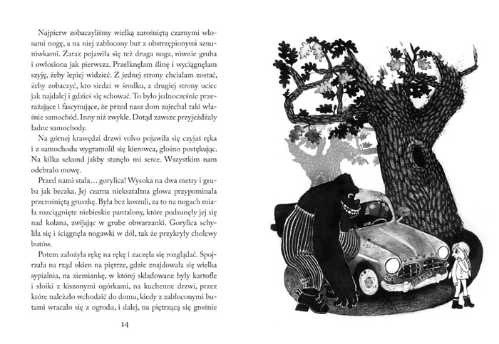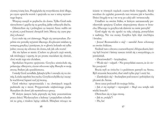 Pewnego dnia przed domem dziecka Czysty Kąt, na starannie zagrabionej żwirowej alejce, hamuje z piskiem opon rozklekotane volvo. Wysiada z niego... gorylica! Przyjechała, by adoptować jedną z sierot. Niemal od razu wie, które to będzie dziecko.