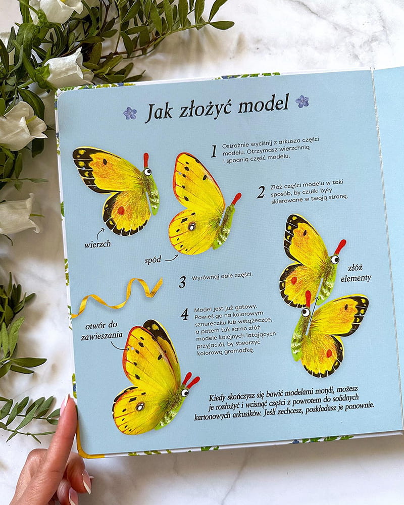 Złóż wspaniałe modele motyli i odkryj fascynujące królestwo naszych latających przyjaciół! Ta przepięknie ilustrowana książka wprowadzi Cię do niesamowitego i zróżnicowanego świata motyli. Wypchnij i połącz ze sobą kolejne elementy, aby cieszyć się unikatowymi wiszącymi ozdobami. Poznaj zadziwiające fakty o każdym z dziesięciu gatunków.