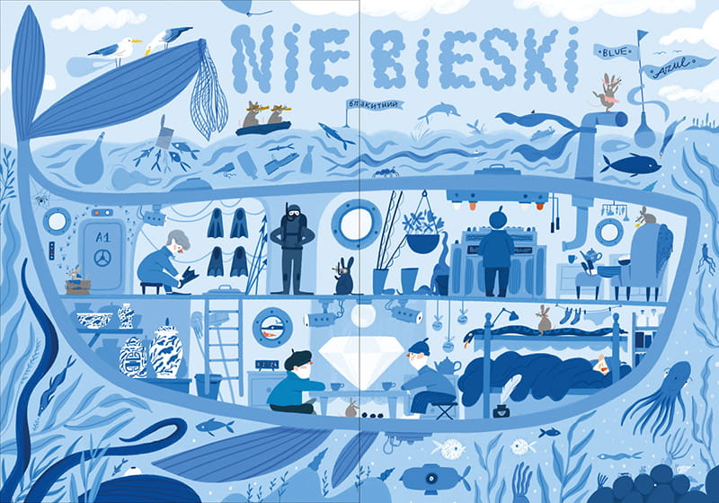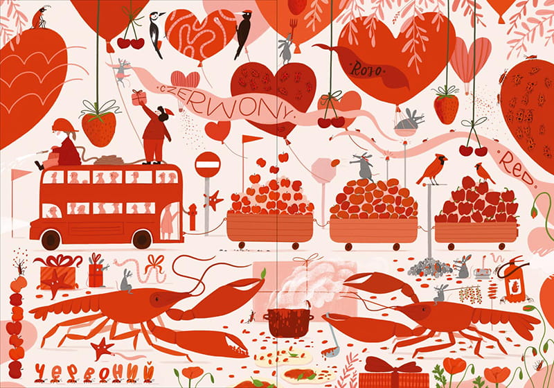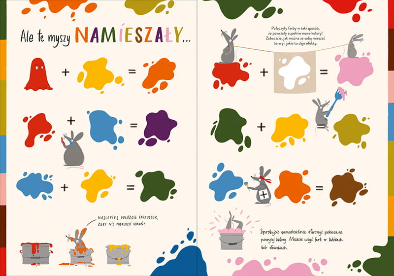Oglądając tę wypełnioną szczegółami książkę, twórzcie swoje kolorowe opowiadania. Jak zacząć? Na przykład: biały miś w białej czapce podaje na obiad białego kalafiora... Albo: biała owca wypiła białe mleko i śpi pod stolikiem nakrytym białym obrusem… Próbujcie wykorzystać jak najwięcej narysowanych elementów. Możecie też poszukać własnego sposobu na opowiadanie. Poza tym na każdej stronie ukryło się osiem psotnych myszy. Znajdźcie wszystkie i rozwiążcie zadania, które przygotowały. Udanej zabawy!