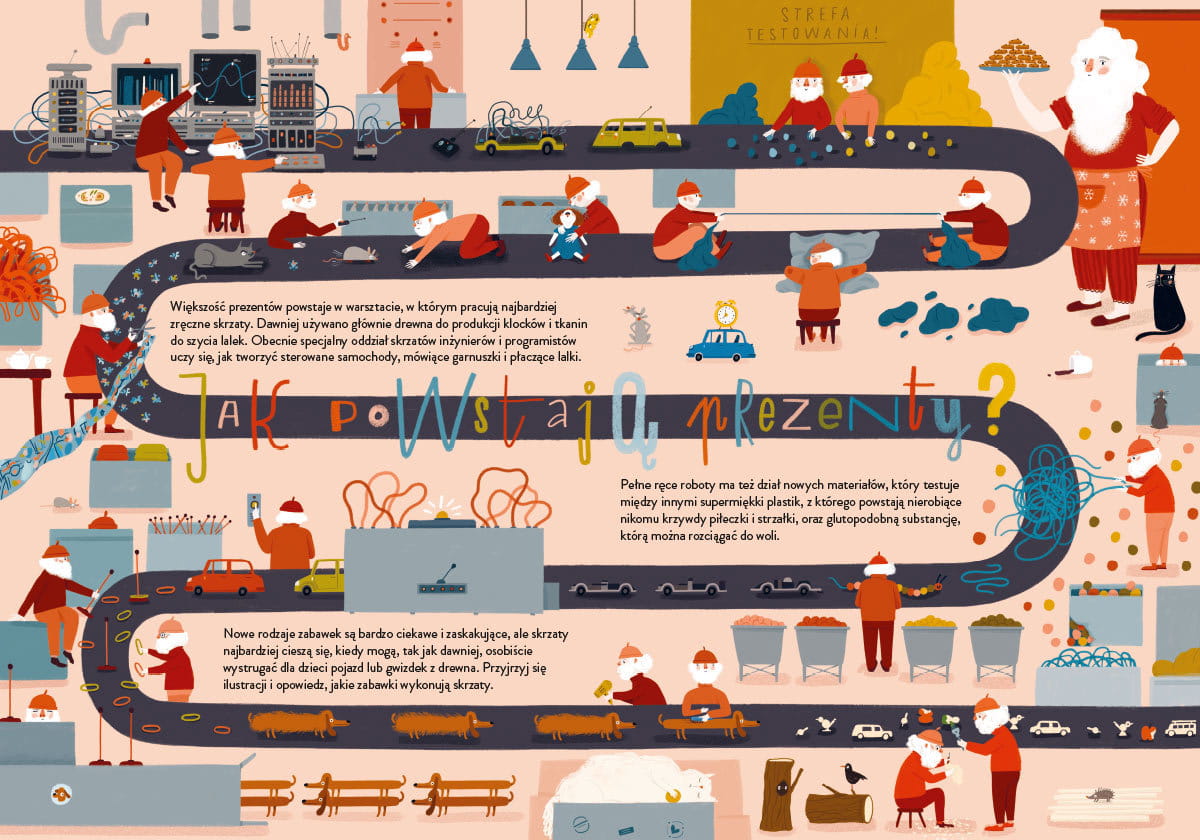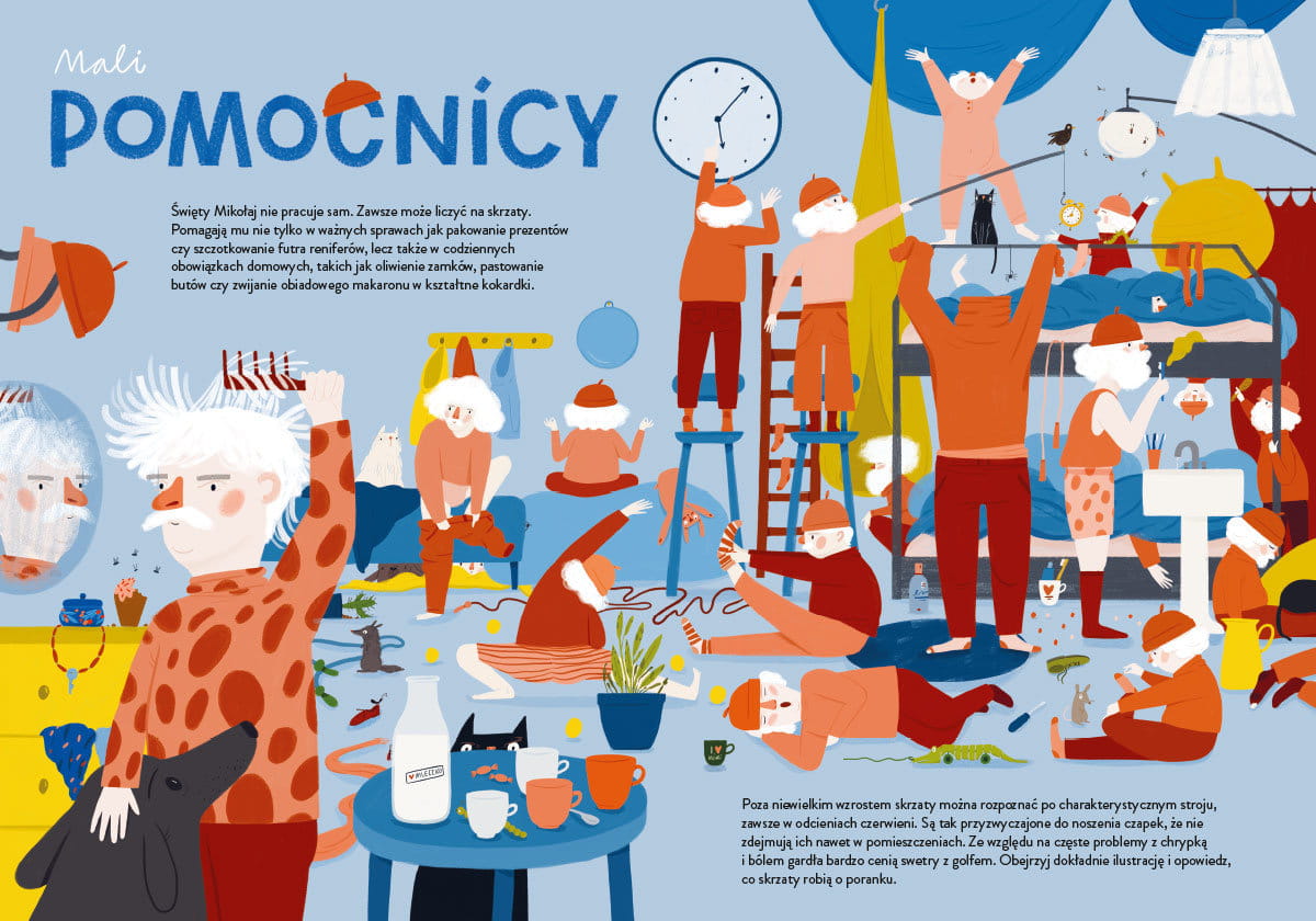 Ciekawscy będą mogli zajrzeć do jego domu oraz poznać tajniki dostarczania prezentów. Jednak książka kryje o wiele więcej tajemnic – na przykład co skrzaty i Mikołaj robią latem, dlaczego pani Mikołajowa ma najwięcej pracy w styczniu czy jak powstają prezenty. Wreszcie autorka zachęci także, aby zastanowić się, o co poprosić Świętego Mikołaja, który jest przecież bardzo zapracowany. Być może właśnie dlatego nie tylko on rozdaje dzieciom na świecie prezenty… A kto jeszcze? O tym także opowiada ta piękna obrazkowa książka.