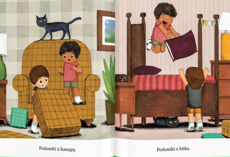 Pomysłowa książka obrazkowa o radości płynącej z zabawy poduszkami, stworzona przez uznanego autora i ilustratora „Koparki i kaczuszki”, „Koparki i kwiatu” oraz „Władców podwórka”.