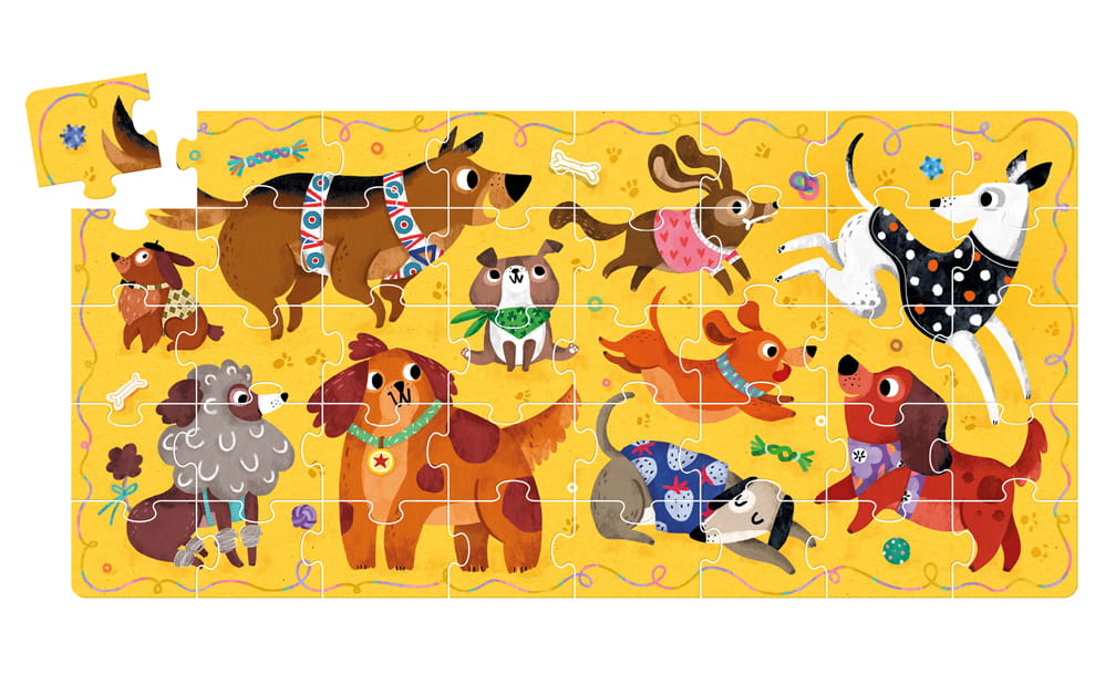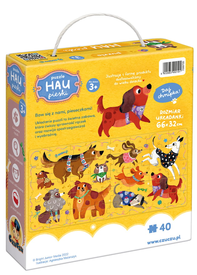 10 wesołych, przyjacielskich psów i psiaków zaprasza do wesołej zabawy, która w pełen frajdy sposób pozwoli doskonalić spostrzegawczość, małą motorykę i wyobraźnię. Duże puzzle składają się z 40 elementów. Świetnie sprawdzą się jako pierwsza trudniejsza układanka dla coraz sprawniejszych układaczy. To pozycja obowiązkowa w pokoju młodych miłośników szczekających czworonogów!