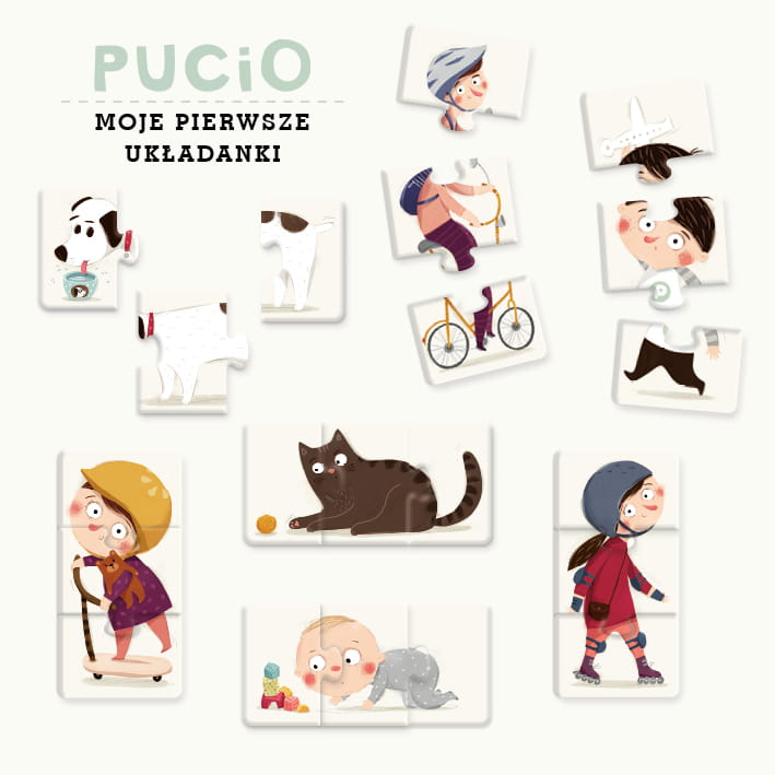 Na poszczególnych obrazkach przedstawiono głównych bohaterów książek Marty Galewskiej-Kustry i Joanny Kłos: Pucia, Misię, Bobo, mamę, tatę, psa Funia i kotkę Mimi. Czyste, jasne tło ułatwia koncentrację na obrazku, dzięki czemu zabawka jest odpowiednia już dla rocznych dzieci.