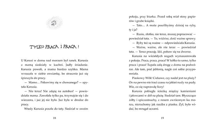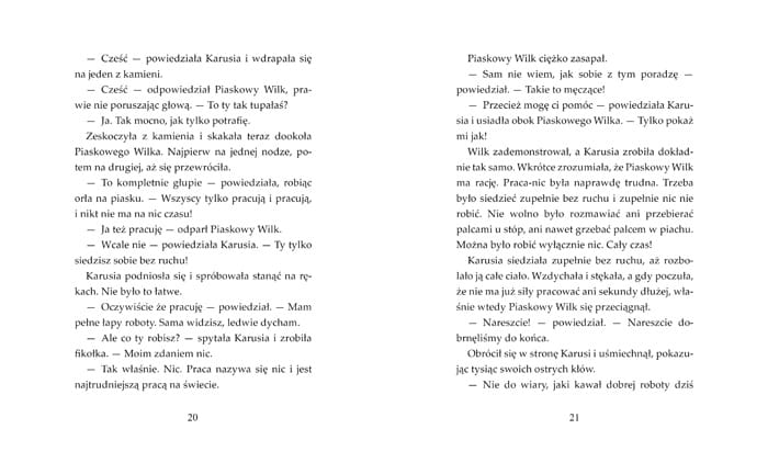 Piaskowy Wilk uwielbia trudne pytania. To dlatego tak dobrze się czuje w towarzystwie Karusi. Opowiada jej rzeczy zapierające dech w piersiach i razem tłumaczą sobie zagadki otaczającego świata. Karusię ciekawi wszystko - komary i miłość, puste kieszenie, nieposłuszne nogi, krótkie chwile, które bywają długie, wszechświat bez końca i czerwone kalosze.