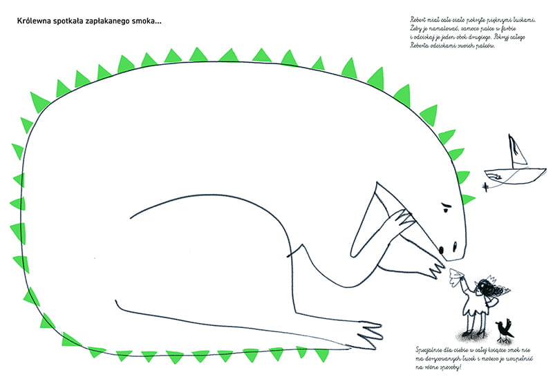 Pewnego razu smok z gęstego lasu i nieustraszona królewna wybrali się razem na wędrówkę. Pomóż im przedostać się przez góry, pobaw się razem z nimi w kałuży i zobacz, kogo spotkali po drodze – a przy okazji rysuj, maluj, wydzieraj i naklejaj.
