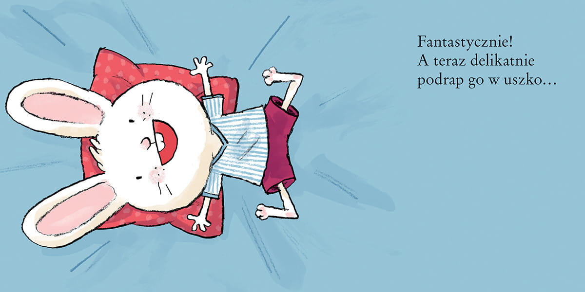 Podrap króliczka w uszko, pogłaszcz po plecach. Przewróć stronę, żeby go przykryć, i daj mu buziaka na dobranoc. I pamiętaj, żeby zgasić światło!