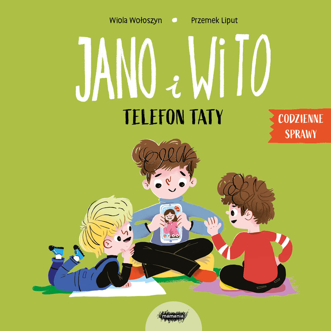 Jano i Wito bawią się klockami, a tata korzysta z telefonu. Dzwoni, pisze wiadomości, sprawdza różne rzeczy. Chłopcy są ciekawi, do czego jeszcze może służyć telefon. Tata pokazuje im różne funkcje, a potem proponuje, aby wszyscy poszli pobawić się na dworze. A telefon? Zostanie w domu!