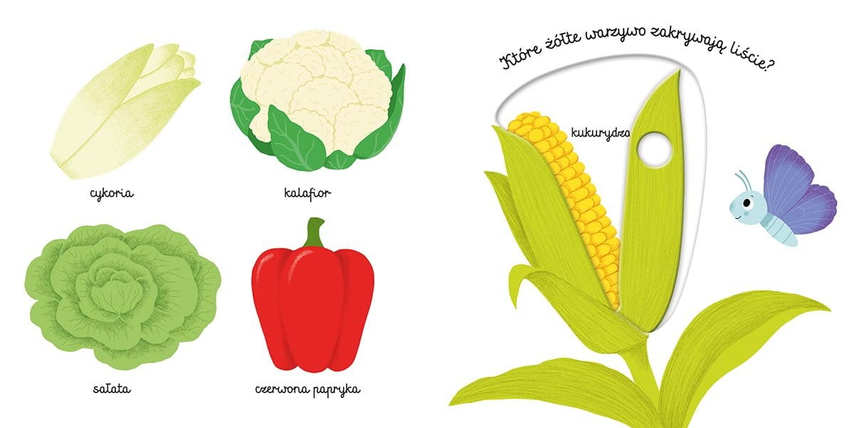 Książeczka Warzywa to kolejna już pozycja w dobrze znanej serii Pierwsze słowa Akademii Mądrego Dziecka. Tym razem mały czytelnik poznaje różne warzywa oraz ich kolory. Dowiaduje się, że pomidory są czerwone i rosną na krzakach, a różowe buraczki - w ziemi. W książeczce znajdzie też inne warzywa, takie jak: por, cebula, brokuł, dynia, sałata, cykoria.