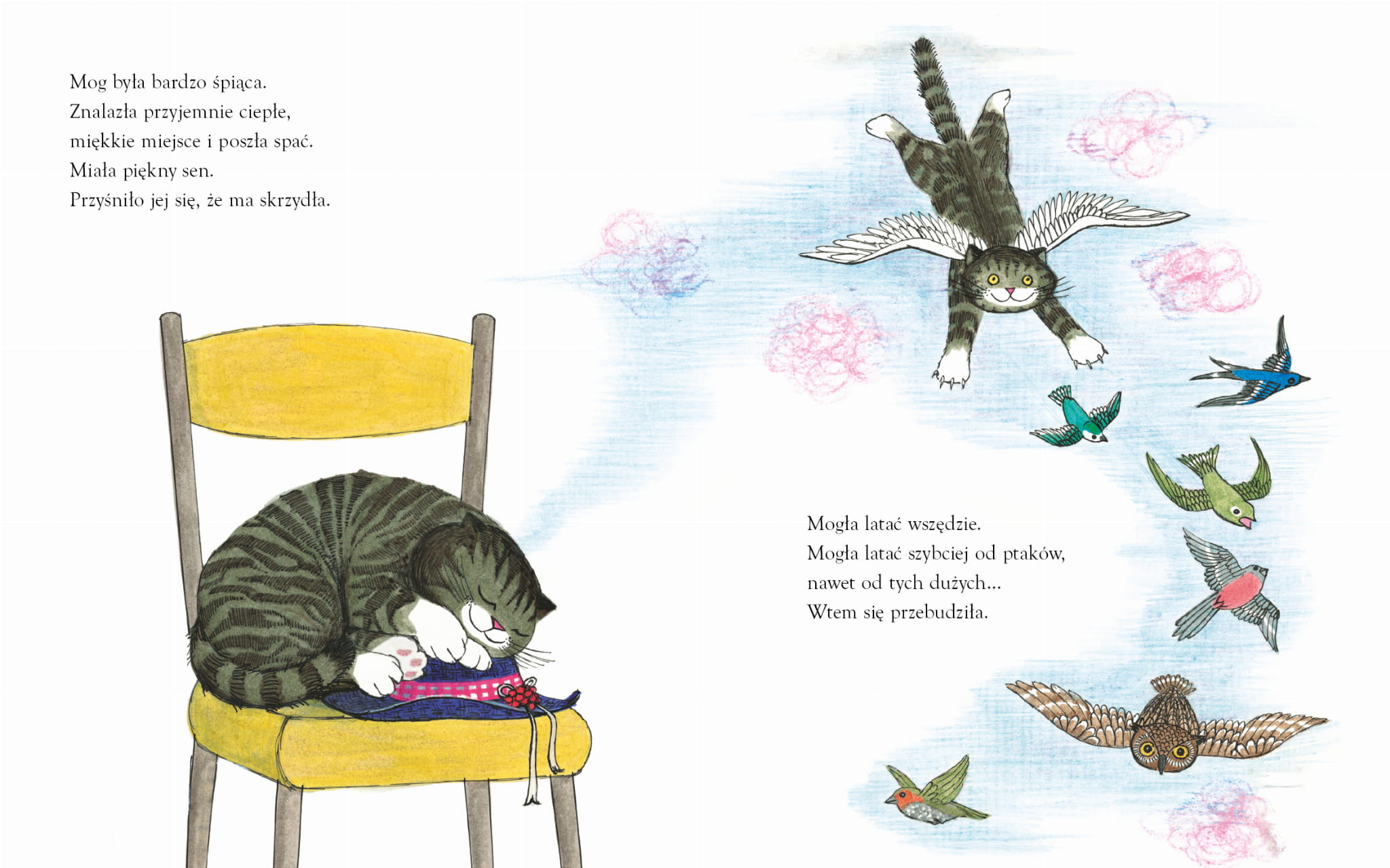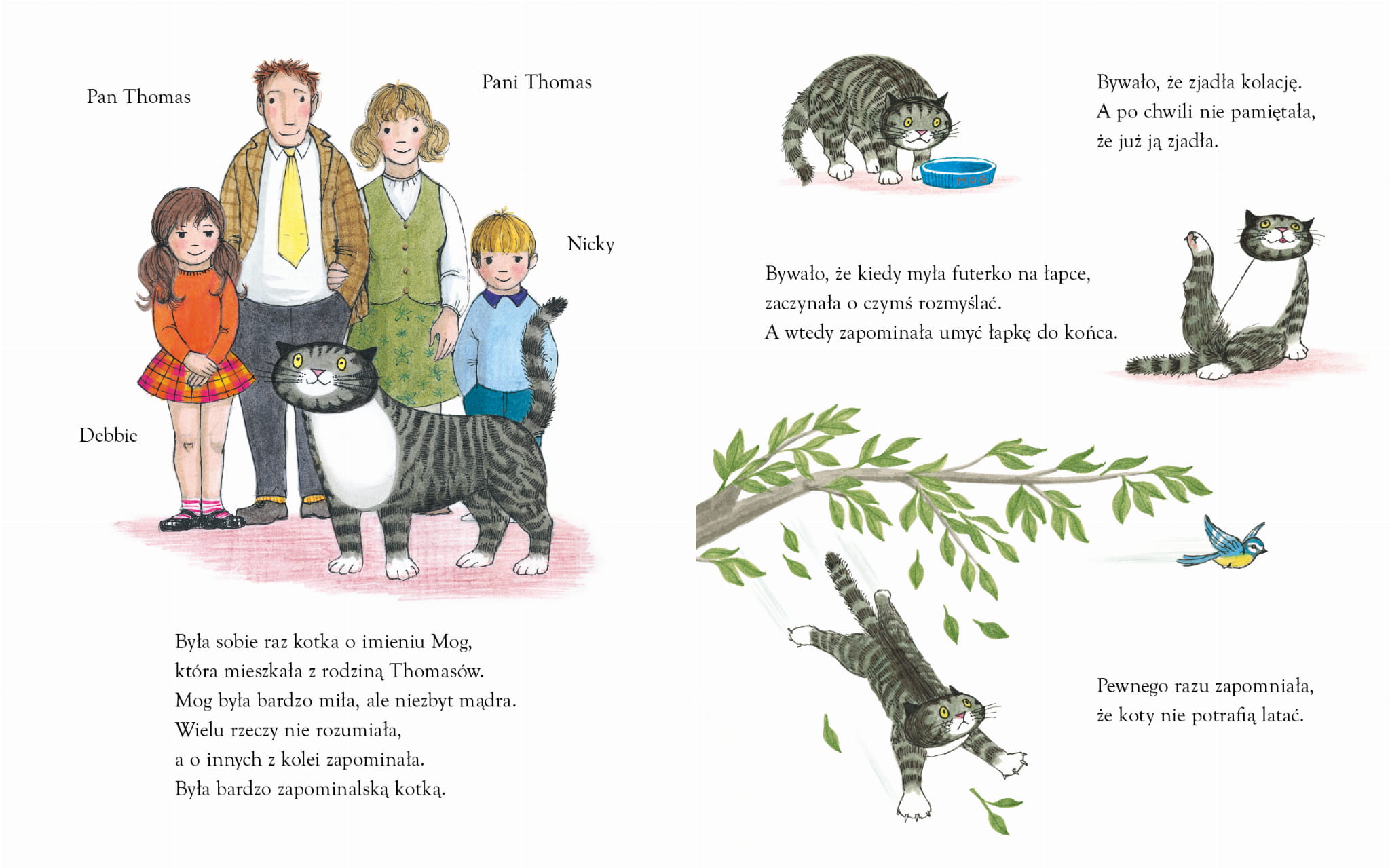 Mog jest przemiłą kotką, kochaną przez całą rodzinę, jednak… okropnie zapominalską! Zapomina o istnieniu kocich drzwiczek, zapomina, że już jadła kolację… Strach pomyśleć, o czym jeszcze może zapomnieć! Ale pewnego razu zapominalstwo Mog baaardzo się przydaje.