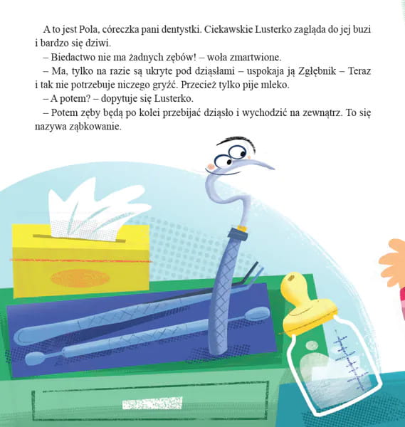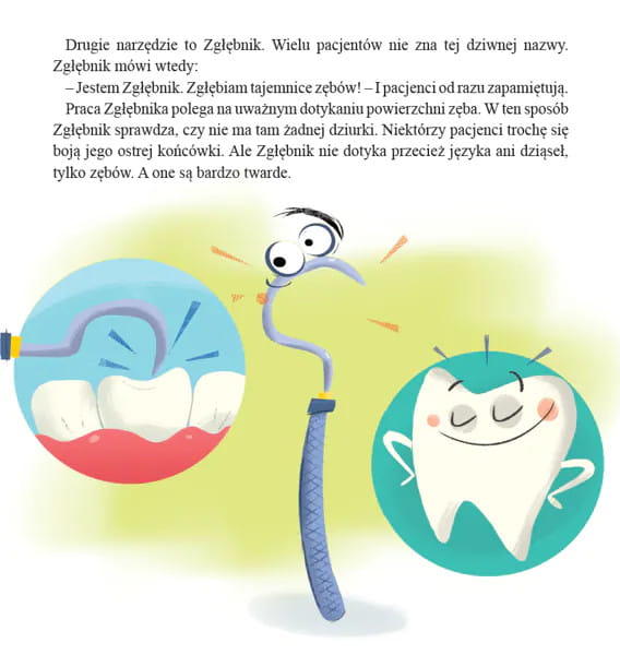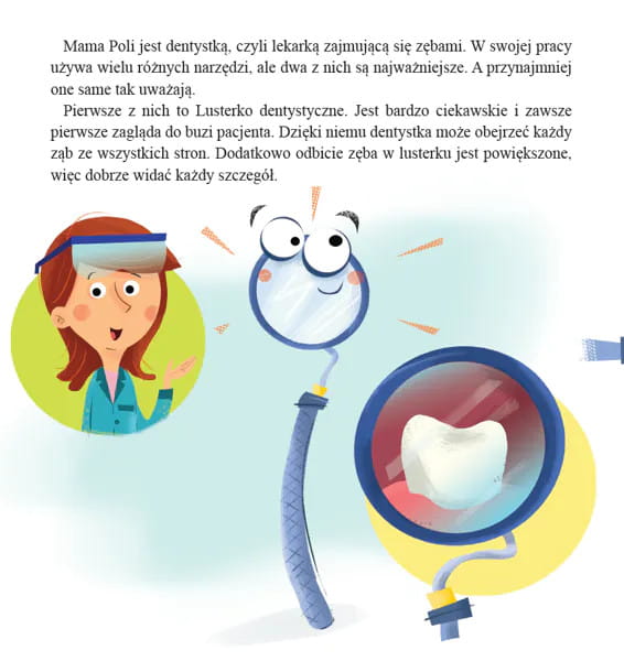 Wraz z Polą i jej mamą oraz dwoma przesympatycznymi narzędziami stomatologicznymi czytelnik odkryje tajniki pracy dentysty, pozna narzędzia i sprzęty, z jakimi ma ON do czynienia na co dzień w swojej pracy, oswoi się z gabinetem lekarskim, a także pozna kolejne etapy leczenia zęba. Dowie się, kiedy pojawiają się pierwsze zęby, a także w jakim wieku zaczynają one wypadać. Przekona się, jak ważna jest higiena, a także odpowiednia dieta. Zrozumie potrzebę regularnych wizyt kontrolnych w gabinecie stomatologicznym. Pozna poszczególne rodzaje zębów, ich budowę oraz sposób, w jaki są umiejscowione. Dowie się, do czego służy nić dentystyczna, a także jakie jest działanie aparatów ortodontycznych.