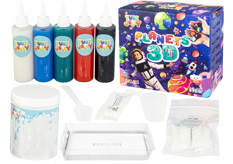 Zestaw zawiera żelowe płyny, aktywator i wszystkie akcesoria potrzebne do przeprowadzenia domowego eksperymentu. Zabawa zestawem jest fantastycznym pretekstem do zgłębiania wiedzy o Kosmosie.