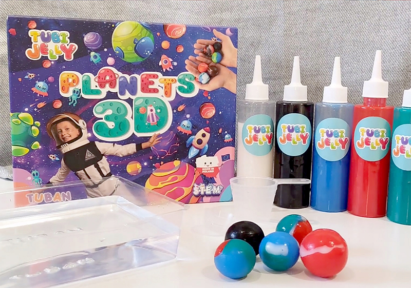 Tubi Jelly to kreatywna zabawka dla dzieci pozwalająca na tworzenie żelkowych planet w różnych rozmiarach i kolorach.
