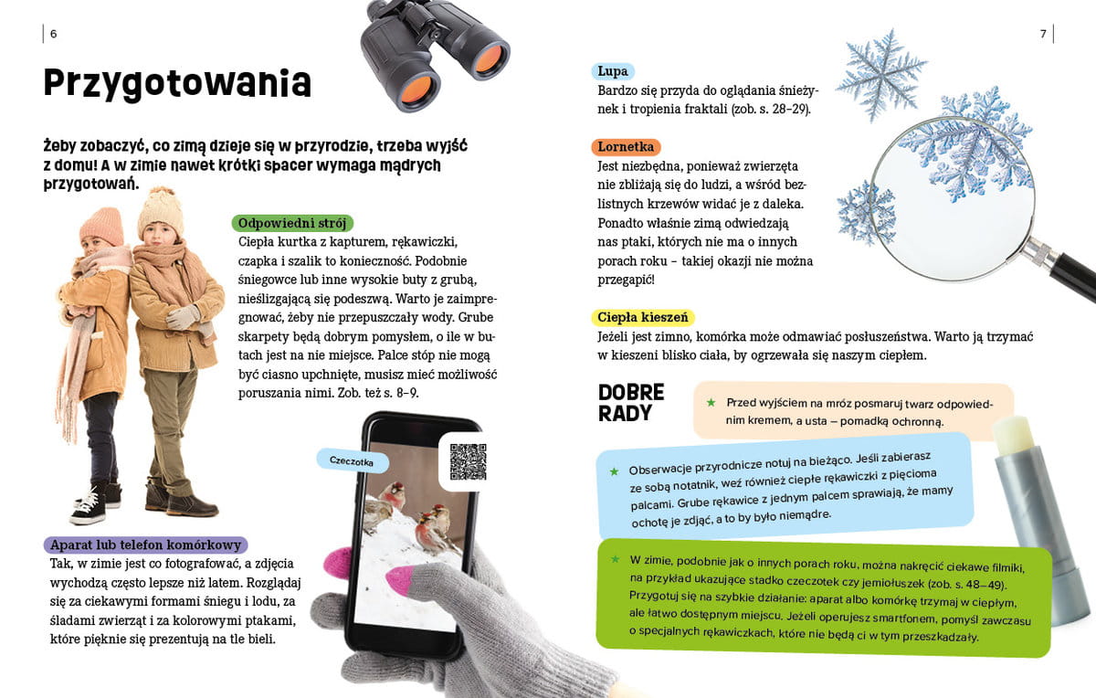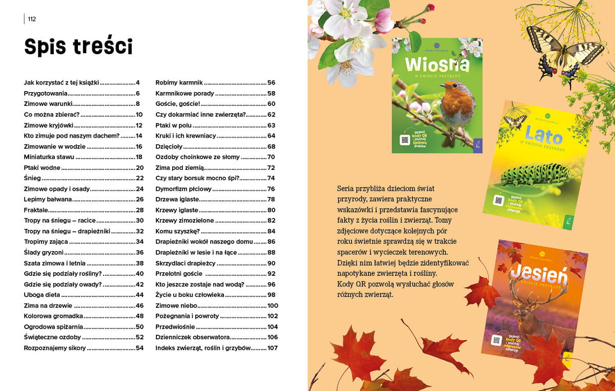 Dziecko dowie się, czym różni się szata letnia od zimowej i jak niektóre zwierzęta zmieniają „ubrania” na zimę. Przeczyta, które zwierzęta są aktywne zimą, a które ją przesypiają. Pozna ich zimowe schronienia, także pod naszym dachem. Nauczy się rozpoznawać tropy na śniegu, zarówno dużych, jak i małych zwierząt. Dowie się, które ptaki zostają z nami na zimę, i nauczy się je właściwie dokarmiać. Zaobserwuje te, które przylatują do nas na okres chłodów z miejsc, w których jest jeszcze zimniej. Zrozumie, dlaczego zimą nie widuje owadów. Pozna zwyczaje zimowych drapieżników, takich jak lis, kuna, łasica, ryś i ptaki drapieżne. Dowie się, co dzieje się zimą pod ziemią i pod wodą.