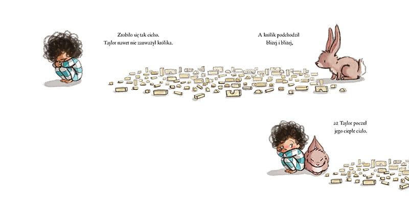 Nagle, w jednej chwili wszystko zostaje zrównane z ziemią. Z fantastycznej budowli pozostaje jedynie stos rozsypanych klocków. Taylor jest zdruzgotany i smutny. Natychmiast zbiegają się zwierzęta, które próbują pomóc chłopcu swoimi radami. Pierwszy przybiega kurczak, później pojawia się niedźwiedź, hiena, struś, kangur, wąż i wiele innych zwierząt. Każde proponuje inne rozwiązanie, jednak żadne nie jest w stanie pocieszyć zrozpaczonego chłopca. Aż wreszcie pojawia się królik. Dopiero mały puszysty przyjaciel potrafi zachować się tak, jak tego potrzebuje Taylor. Zwierzątko daje dziecku swoją uwagę, pozwala mu opowiedzieć o swoich emocjach i słucha go cierpliwie. Czy chłopiec dzięki rozmowie z królikiem odzyska pogodę ducha?